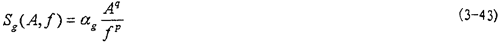 對于(3-22)模型,我們用阻尼耗能的能量關(guān)系來辨識阻尼力與振幅和頻率的關(guān)系。在前面,遲滯回線面積(即阻尼耗能)與振幅的函數(shù)關(guān)系已建立起來,見(3-38)式,而且式中參數(shù)也已辨識出。同樣,用數(shù)值積分,可以算出振幅一定,頻率變化時遲滯回線的面積,由此得出遲滯回線面積與頻率的對應(yīng)關(guān)系,將這些對應(yīng)關(guān)系畫成曲線如圖3-6中大圓點曲線所示。由遲滯回線面積隨頻率變化的規(guī)律分析,可建立其函數(shù)關(guān)系為: