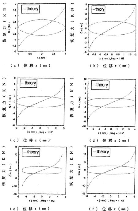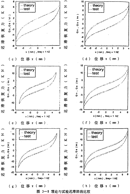 由數(shù)學(xué)模型(3-47) 計(jì)算可以得到不同激勵(lì)頻率和振幅下聯(lián)軸器恢復(fù)力遲滯回線數(shù)據(jù),為了證實(shí)(3-47)的正確性,下面畫出頻率為1赫茲、振幅為1~8毫米各工況下數(shù)學(xué)模型計(jì)算的理論數(shù)據(jù)和試驗(yàn)數(shù)據(jù)表示的遲滯回線圖,如圖(3-8)(a)~(h)(見51~52頁)所示,圖中虛線為理論回線,實(shí)線為試驗(yàn)遲滯回線。從圖中可知,理論遲滯回線十分接近試驗(yàn)遲滯回線,由此可以說明建立的聯(lián)軸器數(shù)學(xué)模型(3-47)式可較好地描述恢復(fù)力隨振幅A頻率f、瞬時(shí)位移x和速度