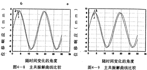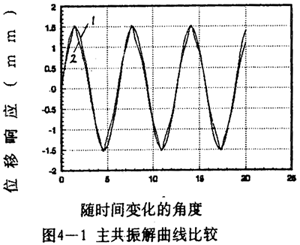 =2時兩者的重合性很好。(2).隨著振幅的增大,解析解曲線1和仿真解曲線2在相位上產(chǎn)生微小變化,解析解的相位超前仿真一個小量,原因是隨著振幅的增大,系統(tǒng)呈現(xiàn)更為強(qiáng)烈的非線性,而在推導(dǎo)中略去了高次項(xiàng),但還是可以滿足工程的要求。(3)從(4-78)-(4-85)式中的各δ值可知,在聯(lián)軸器產(chǎn)生主共振的情況下,激振力很小。