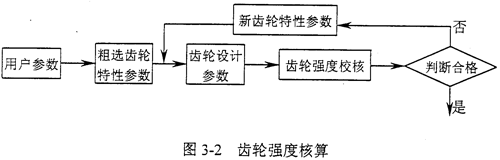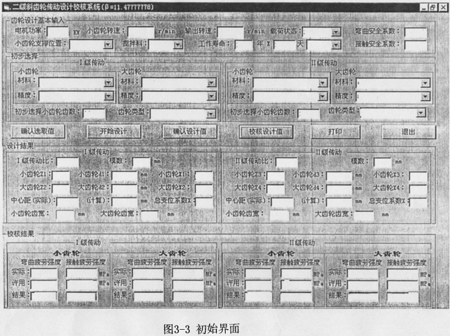 在這三類參數(shù)中,用戶參數(shù)是要由用戶給定,齒輪特性參數(shù)是要得到的結(jié)果,齒輪設(shè)計(jì)參數(shù)是一種中間描述參數(shù),它需要通過一系列的復(fù)雜的計(jì)算求解,而齒輪設(shè)計(jì)的科學(xué)性也就是通過對齒輪設(shè)計(jì)參數(shù)的精確確定而實(shí)現(xiàn)的,具體計(jì)算機(jī)實(shí)現(xiàn)公式見3.6-3.8;齒輪的接觸強(qiáng)度與彎曲強(qiáng)度校核分別見3.3和3.4。系統(tǒng)的參數(shù)初始輸入界面見圖3-3。