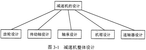 減速機(jī),作為一個完整的傳動系統(tǒng),其設(shè)計(jì)包括:齒輪設(shè)計(jì),傳動軸設(shè)計(jì),軸承設(shè)計(jì),機(jī)箱設(shè)計(jì)以及連軸器設(shè)計(jì),如圖3-1所示。