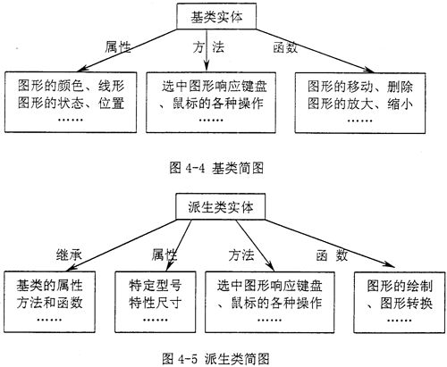 對(duì)于以上的問(wèn)題,第一,要對(duì)行業(yè)的需求十分清晰,能夠?qū)π袠I(yè)中涉及到的工程實(shí)體進(jìn)行歸納,要具有“面向?qū)ο蟆钡木幊趟季S;第二,基類涉及的屬性方法和函數(shù)基本上與實(shí)體圖形的操作有密切關(guān)系(如圖4-4所示);派生類主要涉及到工程實(shí)體的特征屬性、特征方法和特征函數(shù)(如圖4-5示),完整地定義其基類和派生類是“面向?qū)ο蟮腃AD集成開(kāi)發(fā)系統(tǒng)”中的核心部分;第三,要充分的利用AutoCAD已提供的資源,主要就是要利用AutoCAD系統(tǒng)中的*,dwg文件的圖形文件數(shù)據(jù)庫(kù)中的資源,熟悉各種AutoCAD中實(shí)體(例如點(diǎn)、直線、圓弧等)的DXF碼規(guī)則,并從中提取相關(guān)特征信息;第四,由于在AutoCAD中的.dwg文件中,存儲(chǔ)的是一些簡(jiǎn)單的幾何的點(diǎn)、直線、圓、弧等信息,故還需要另一個(gè)文件去記錄整個(gè)圖紙的工程實(shí)體圖形的邏輯關(guān)系(下一節(jié)詳細(xì)介紹),隨同*.dwg文件的打開(kāi)而打開(kāi),標(biāo)識(shí)*.dwg文件圖形中的實(shí)體圖形邏輯關(guān)系,隨同*.dwg文件的關(guān)閉而記錄*.dwg文件中的實(shí)體圖形邏輯關(guān)系。