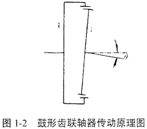 鼓形齒聯(lián)軸器傳動原理如圖1-2所示。鼓形齒聯(lián)軸器的內(nèi)齒輪為一直齒內(nèi)齒輪,外齒輪是齒頂面為一球面的鼓形齒輪。根據(jù)外齒輪齒面形成方式的不同,外齒輪又分為共軛齒面鼓形齒輪和非共軛齒面鼓形齒輪。由于鼓形齒輪加工工藝的關(guān)系,現(xiàn)使用的鼓形齒聯(lián)軸器多為非共軛齒面外齒輪的鼓形齒聯(lián)軸器。共軛齒面的鼓形齒齒面由與內(nèi)齒輪共軛的加工方式產(chǎn)生;非共軛齒面的鼓形齒齒面相當(dāng)于在不同端截面逐漸變位的一系列齒輪片機(jī)疊而成,變位量與軸向坐標(biāo)形成的曲線稱為鼓度曲線。鼓度曲線是鼓形齒聯(lián)軸器特有的重要幾何參數(shù),現(xiàn)所用的多為一段圓弧,也有用三段圓弧的,這些圓稱為位移圓。在圓弧鼓度曲線中,有位移中心在齒輪軸線上的,有不在軸線上的;有位移圓中心與齒頂球面中心重合的,也有不同中心的,鼓度曲線的設(shè)計無統(tǒng)一理論方法,通常是以經(jīng)驗(yàn)設(shè)計。究竟采用哪種曲線,有不同的考慮方面,總的選定要求是:(1)在軸間傾角處于最大時不出現(xiàn)棱邊接觸現(xiàn)象;(2)輪齒集中載荷越小越好,而齒面曲率與位移圓曲率成正比,因此位移圓半徑應(yīng)盡可能大。鼓度曲線曲率半徑與內(nèi)齒單側(cè)減薄量成正比關(guān)系,即它與齒的嚙合間隙有關(guān),減薄量不足可能會造成干涉,減薄量過大則會削弱齒的強(qiáng)度且側(cè)隙太大。