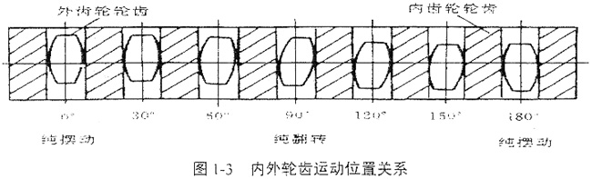 鼓形齒聯(lián)軸器的運(yùn)動是復(fù)雜的空間運(yùn)動,現(xiàn)有資料均把它簡化為展開的平面運(yùn)動來進(jìn)行分析,在有軸間傾角的狀態(tài)下,將運(yùn)動分為齒的擺動運(yùn)動和翻轉(zhuǎn)運(yùn)動。這兩種運(yùn)動在嚙合過程的半周中經(jīng)歷純擺動—復(fù)合運(yùn)動—純翻轉(zhuǎn)—復(fù)合運(yùn)動—純擺動的循環(huán)運(yùn)動過程,如圖1-3所示。純擺—純翻轉(zhuǎn)的相位差為90°。在非純擺動和純翻轉(zhuǎn)運(yùn)動過程中,內(nèi)外齒的相對運(yùn)動是擺動運(yùn)動和翻轉(zhuǎn)運(yùn)動的復(fù)合運(yùn)動。顯然這種簡化分析方法是很粗略的,無法確切地描述它們的空間嚙合狀態(tài),但是它對于分析齒向位移、棱邊卡死現(xiàn)象及說明某一輪齒所處周向位置是有意義的。