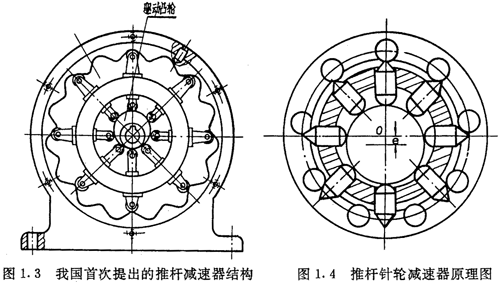 推桿減速器雖然和其它活齒傳動(dòng)機(jī)構(gòu)在原理上基本相同,但由于采用獨(dú)特的推桿作為活齒構(gòu)件,所以機(jī)構(gòu)本身有它的特殊性。并且經(jīng)歷了若干次結(jié)構(gòu)上的更新,才發(fā)展成為目前這種已形成工業(yè)生產(chǎn)能力的結(jié)構(gòu)形式。