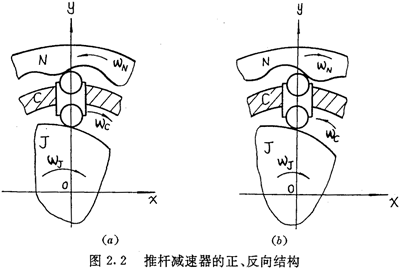 在推桿減速器中,設(shè)激波器按順時(shí)針?lè)较蛐D(zhuǎn),則傳動(dòng)圈C,內(nèi)齒圈N的轉(zhuǎn)向可能與激波器相同,也可能相反(圖2.2)。為了研究問(wèn)題的方便,本文中稱(chēng)傳動(dòng)圈與主動(dòng)件激波器轉(zhuǎn)向相同的結(jié)構(gòu)為正向結(jié)構(gòu)(圖2.2(a)),稱(chēng)傳動(dòng)圈與激波器轉(zhuǎn)向相反的結(jié)構(gòu)為反向結(jié)構(gòu)(圖2.2(b))。