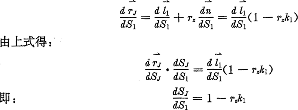 下面再推導(dǎo)一下齒廓及其法向等距線(xiàn)的相對(duì)曲率關(guān)系。設(shè)HJ的孤長(zhǎng)參數(shù)為SJ,相對(duì)曲率為kJ,而H1的孤長(zhǎng)參數(shù)為S1,相對(duì)曲率為k1,由微分幾何可得: