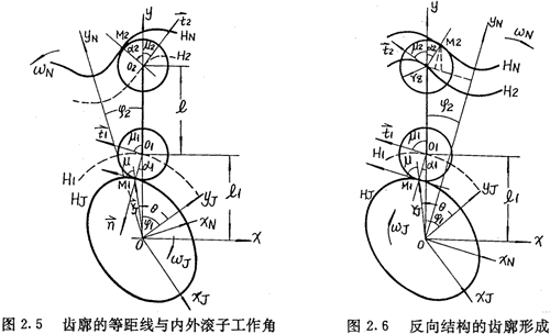 本章根據(jù)推桿減速器的結(jié)構(gòu)特征,找出了推桿內(nèi)外滾子工作角之間的關(guān)系。這種關(guān)系不僅適用于激波器廓形為偏心圓的單激波推桿減速器結(jié)構(gòu),而且也適用于激波器廓形為非圓弧曲線(xiàn)的多激波推桿減速器。利用內(nèi)外滾子工作角之間的關(guān)粵和法向等距線(xiàn)的幾何性質(zhì),首次分析研究了激波器廓形為任意形狀非圓弧曲線(xiàn)的多激波推桿減速器的齒廓形成理論,與傳統(tǒng)的包絡(luò)法相比,具有概念清晰,所得公式形式簡(jiǎn)單的特點(diǎn),通過(guò)實(shí)例計(jì)算,證明了激波器為偏心圓的推桿減速器,其內(nèi)齒圈齒廓曲線(xiàn)不是擺線(xiàn)這一重要結(jié)論。