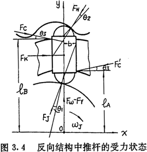 在傳動圈與激波器轉向相反的結構中,工作推桿的受力狀誠如圖3.4所示。從受力狀態(tài)圖可以看出,在運動過程中,推桿與導槽必然形成雙側接觸。推桿兩側將造成嚴重磨損,實際生產中,應避免使用反向結構。