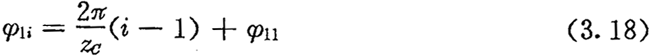 由于相鄰兩推桿所夾的中心角為2π/ZC,在某一時刻,只要其中一個工作推桿所對應的激波器位置角(激波器相對該推桿從初始工作位置轉過的角度φ1)確定后,其它各工作推桿所對應的激波器位置角也隨之確定下來。設各工作推桿所對應的最小激波器位置角為φ11,如圖3.6所示,則從對應激波器位置角為φ11的這個工作推桿開始,順序第i個工作椎桿所應的激波器位置角φ1i為: