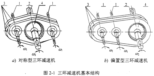 三環(huán)減速機(jī)是在普通減速機(jī)技術(shù)的基礎(chǔ)上,為適應(yīng)現(xiàn)代機(jī)械設(shè)備對(duì)傳動(dòng)機(jī)構(gòu)的要求而開發(fā)的一種新型傳動(dòng)裝置。三環(huán)減速機(jī)的基本結(jié)構(gòu)如圖2一1所示,a)是對(duì)稱型三環(huán)減速機(jī)傳動(dòng),b)是偏置型三環(huán)減速機(jī)傳動(dòng)。它由兩根高速偏心輸入軸1、低速輸出軸2、三片內(nèi)齒環(huán)板3和輸出外齒輪4構(gòu)成。三片內(nèi)齒環(huán)板3偏心安裝在兩根高速輸入軸1上,為了平衡內(nèi)齒環(huán)板的慣性力和慣性力偶矩,兩側(cè)環(huán)板與中間環(huán)板偏心之間的相位差為180°,且中間環(huán)板的厚度為兩側(cè)環(huán)板厚度的兩倍,它們都與外齒輪4相嚙合。外齒輪4安裝在低速輸出軸2上,各軸均平行配置,可以單獨(dú)或同時(shí)傳輸動(dòng)力。在本文研究的三環(huán)減速機(jī)中,為了克服死點(diǎn)及降低高速偏心軸的轉(zhuǎn)速,采用兩級(jí)傳動(dòng)實(shí)現(xiàn)雙軸驅(qū)動(dòng),帶動(dòng)三片內(nèi)齒環(huán)板作曲線平動(dòng),每片內(nèi)齒環(huán)板都相當(dāng)于一相平行四邊形雙曲柄機(jī)構(gòu)的連桿,環(huán)板上每一點(diǎn)的軌跡都是以偏心軸的偏心距為半徑的圓。兩側(cè)環(huán)板與中間環(huán)板以180°圓心角的間隔與外齒輪相嚙合,形成大速比,通過輸出軸傳遞運(yùn)動(dòng)和轉(zhuǎn)矩。