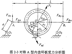 三環(huán)減速機(jī)的精確受力分析是指導(dǎo)三環(huán)減速機(jī)設(shè)計(jì)的基礎(chǔ),采用類比和估算設(shè)計(jì)制造出的產(chǎn)品存在諸多問題。為此,本章將對(duì)三環(huán)減速機(jī)的受力分析進(jìn)行深入的研究,并且探討三環(huán)減速機(jī)傳動(dòng)機(jī)理。選取內(nèi)齒環(huán)板為受力分析對(duì)象,它受有重力Gi、慣性力Pi和嚙合力Fni,其中嚙合力Fni是主要的受力形式?紤]到三環(huán)減速機(jī)內(nèi)齒環(huán)板的轉(zhuǎn)速較高,且其質(zhì)量較大,故在力學(xué)分析中必須將內(nèi)齒環(huán)板的慣性力和重力考慮在內(nèi)。首先分析內(nèi)齒環(huán)板的慣性力,參考如圖2-3所示的對(duì)稱A型三環(huán)減速機(jī)內(nèi)齒環(huán)板的受力分析圖,假設(shè)內(nèi)齒環(huán)板的質(zhì)量為mi,轉(zhuǎn)臂軸承的質(zhì)量為miH,內(nèi)齒環(huán)板的質(zhì)心在O點(diǎn),兩轉(zhuǎn)臂偏心軸的質(zhì)心分別在Ai和Bi點(diǎn),轉(zhuǎn)臂的轉(zhuǎn)速為nH。r2、rb2分別為內(nèi)齒輪2的分度圓半徑和基圓半徑,e為轉(zhuǎn)臂偏心距,即內(nèi)、外齒輪的實(shí)際中心距。內(nèi)齒輪2的齒數(shù)為Z2,外齒輪的齒數(shù)為Z1,m為齒輪模數(shù)。因內(nèi)齒環(huán)板做平動(dòng),則n2=0,其質(zhì)心O以轉(zhuǎn)速nH轉(zhuǎn)動(dòng),軌跡是以e為半徑的圓,則