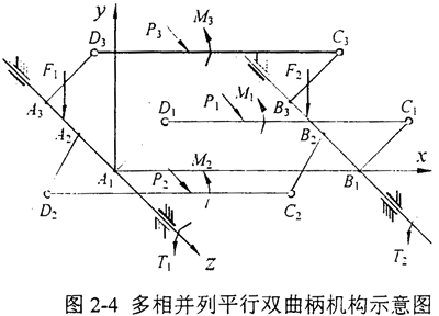 三環(huán)減速機(jī)由于其原理的獨(dú)特性,引起了人們的廣泛關(guān)注。為了便于進(jìn)一步研究這種傳動(dòng)形式,解決實(shí)際應(yīng)用中的各種問題,因此有必要對(duì)這種新型傳動(dòng)形式的受力情況進(jìn)行研究。本章主要求解本文提出的兩級(jí)三環(huán)減速機(jī)的二級(jí)少齒差傳動(dòng)部分的受力。三環(huán)減速機(jī)采用三相并列平行雙曲柄機(jī)構(gòu)一一種自由度小于1的過約束機(jī)構(gòu),屬于超靜定問題,機(jī)構(gòu)受力無法用平面剛體力學(xué)方法完全確定,必須建立變形協(xié)調(diào)條件補(bǔ)充受力方程,才能求解機(jī)構(gòu)受力。為此,本章首先進(jìn)行了三環(huán)減速機(jī)的運(yùn)動(dòng)分析和機(jī)構(gòu)分析,然后根據(jù)結(jié)構(gòu)力學(xué)求解超靜定問題的位移法,結(jié)合三環(huán)減速機(jī)的傳動(dòng)特性,提出了相應(yīng)的變形協(xié)調(diào)條件,建立了對(duì)稱A型、對(duì)稱B型、偏置型三環(huán)減速機(jī)和星型減速機(jī)內(nèi)齒環(huán)板的受力分析模型,分別求解四種形式機(jī)構(gòu)的受力,并且分析比較了在相同的傳動(dòng)技術(shù)參數(shù)條件下,不同形式的三環(huán)減速機(jī)的受力性能。