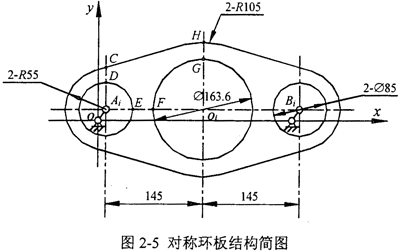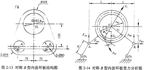 對(duì)稱B型三環(huán)減速機(jī)的一塊環(huán)板的結(jié)構(gòu)如圖2-13所示,它的受力情況和坐標(biāo)系選取如圖2-14所示,符號(hào)的標(biāo)定及含義同對(duì)稱A型三環(huán)減速機(jī)。