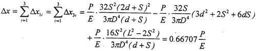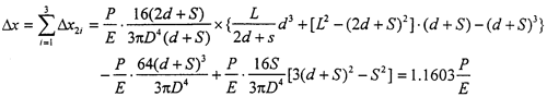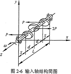 對(duì)于三環(huán)減速機(jī)輸入軸來說,結(jié)構(gòu)及受載情況如圖2-6所示,其中軸有效長(zhǎng)度L=116mm,d=30.5mm,S=27.5mm,輸入軸直徑D=25mm,如果環(huán)板所受載荷為P,則兩側(cè)環(huán)板處輸入軸在x方向的撓度△x為三個(gè)撓度的疊加: