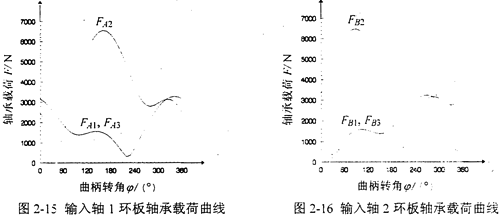L=105mm,L′=100mm,Z1=42,Z2=44,m=3.5mm,α=20°,α′=37.356°,T=875N·m,n=1440r/min,b1=19mm,b2=38mm。則兩輸入軸的偏心軸頸上的環(huán)板軸承載荷FAi、FBi,隨輸入曲柄轉(zhuǎn)角φ變化的曲線如圖2-15、2-16所示。
