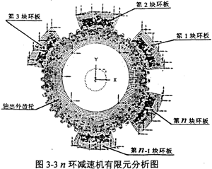 對(duì)于如圖3-3所示的具有n個(gè)內(nèi)齒環(huán)板的減速機(jī)有限元分析模型,本章運(yùn)用I-DEAS分析軟件,采用間隙單元法,在與工況一致的載荷和邊界條件下,分別求出各個(gè)環(huán)板上的主應(yīng)力的最大值和平均值,運(yùn)用公式(3-7)就可得到n環(huán)少齒差減速機(jī)的載荷分配不均勻系數(shù)KP。