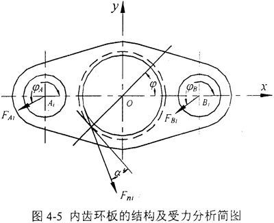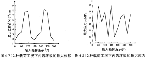 由圖4-7、4-8可知,內(nèi)齒環(huán)板的應力與位移都以360°為周期變化,最大位移出現(xiàn)在φ=270°時的工況位置,這是因為此時的嚙合力Fni和Bi孔與配合軸間的作用力FBi都出現(xiàn)在φ=270°附近,它們的彎曲效應和剪切效應共同作用,出現(xiàn)位移的最大值點,同時也說明環(huán)板的最上部、最下部是環(huán)板位移的瓶頸環(huán)節(jié);最大應力出現(xiàn)在180°+α′時的工況位置,這是因為此時的嚙合力Fni、Ai孔與配合軸間的作用力FAi和Bi孔與配合軸間的作用力FBi都出現(xiàn)在φ=180°附近,它們的彎曲效應和剪切效應共同作用,出現(xiàn)應力的最大值點,同時也說明環(huán)板內(nèi)齒輪與兩個Ai孔、Bi孔的聯(lián)接部分是內(nèi)齒環(huán)板應力的瓶頸環(huán)節(jié)。