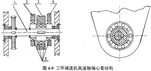 在三環(huán)減速機中,高速輸入軸上要加工三對偏心軸頸,依次安裝三個環(huán)板。由于中間一塊環(huán)板的安裝比較困難,一般采用圖4-9所示的偏心套結(jié)構(gòu),高速軸1與偏心套2、3、4之間通過平鍵聯(lián)接,軸與偏心套之間為過渡配合H7/k6,而偏心套通過環(huán)板軸承5與環(huán)板相聯(lián)。