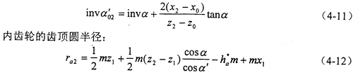 變位系數(shù)的確定是少齒差內(nèi)嚙合傳動設計的關鍵。文獻中所述的內(nèi)、外齒輪都按滾齒加工的計算公式推導出的變位系數(shù)的迭代公式,與內(nèi)齒輪插齒、外齒輪滾齒的實際加工情況不一致,雖然能夠保證給定的重合度和齒廓不重迭干涉系數(shù)的要求,但是不能保證標準頂隙,而且一般得出的嚙合角也比較大。本章推導了少齒差內(nèi)嚙合傳動實際加工情況的變位系數(shù)的迭代公式,解決了上述問題。