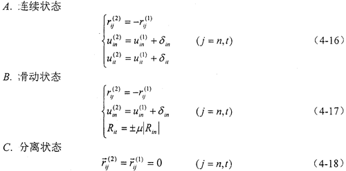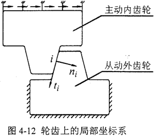 用rij和uij分別表示輪齒在第i個(gè)接觸點(diǎn)局問坐標(biāo)系j(j=n,t)方向上的接觸力分量和位移分量,局部坐標(biāo)系如圖4-12所示,上標(biāo)(1)、(2)分別表示主動內(nèi)齒輪和從動外齒輪,則