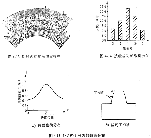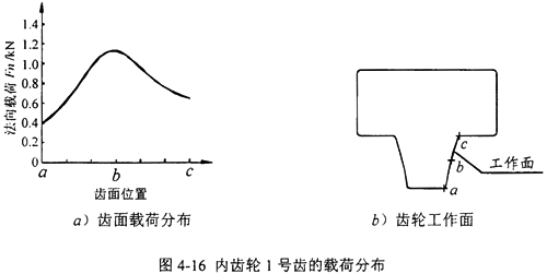 經(jīng)過間隙單元法迭代計(jì)算,得到嚙合過程中,由于輪齒的變形而形成了多齒接觸。圖4-14所示為由于輪齒的變形,形成了5個(gè)齒的接觸,以及載荷在輪齒之間的分配比例。當(dāng)有5個(gè)齒參與嚙合時(shí),最大主應(yīng)力為73MPa;假定內(nèi)、外齒輪的1號齒在齒面上b點(diǎn)相互接觸,圖4-15所示為輪齒接觸時(shí),外齒輪上載荷最大的輪齒1號面的齒面載荷分布情況:圖4-16所示為輪齒接觸時(shí),內(nèi)齒輪上載荷最大的輪齒1號面的齒面載荷分布情況。