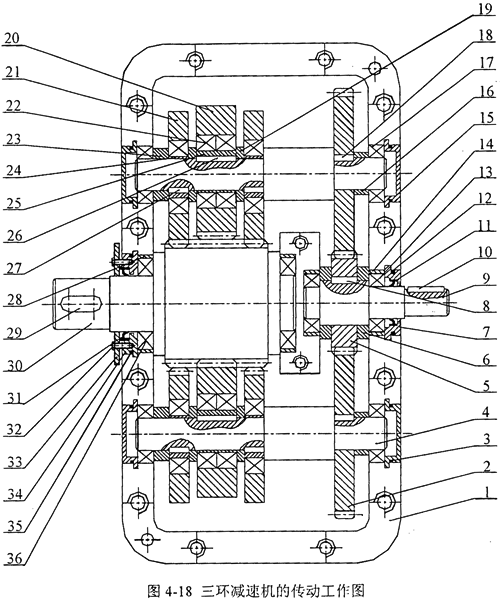 根據(jù)三環(huán)減速機(jī)的基本參數(shù)和結(jié)構(gòu)參數(shù),設(shè)計(jì)出三環(huán)減速機(jī)的傳動工作圖如圖4-18所示。