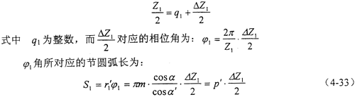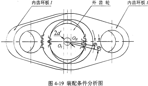 下面來分析它的裝配條件,由于本文提出的新型三環(huán)減速機(jī)環(huán)板相互之間的相位差為180°,所以在分析時(shí),可以只分析兩塊環(huán)板的裝配情況。圖4-19所示為裝配條件分析圖,在兩塊環(huán)板的偏心所構(gòu)成的π角內(nèi),外齒輪1的齒數(shù)為: