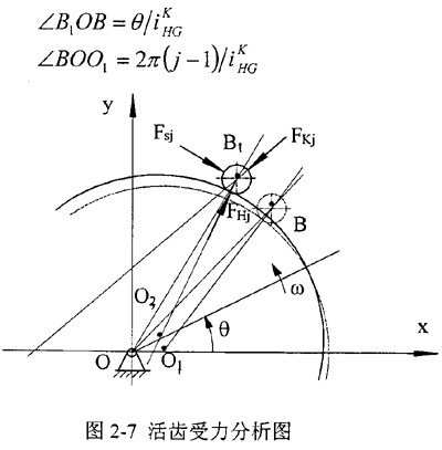 固定中心輪R,不失一般性,選擇活齒數ZG與中心輪齒數ZR之差為1。此時傳動比大小等于活齒個數。假設開始時,波發(fā)生器的幾何中心O1在X軸上,該活齒中心在B點,波發(fā)生器以角速度ω逆時針轉動。t時刻時,波發(fā)生器轉過θ角,該活齒中心運動到Bl點,波發(fā)生器的幾何中心從Ol運動到O2;Fsj、FHj、FKj分別為活齒架、波發(fā)生器、中心輪對該滾柱活齒的法向壓力。