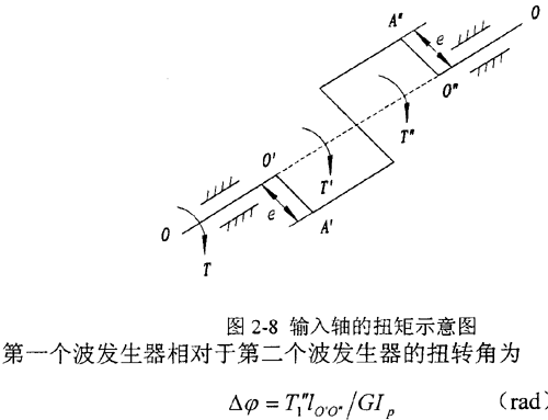 在實際應用中,為平衡掉負載對支承的徑向作用,一般采用180°對稱布置的雙排結構,兩排活齒共用一個活齒架。圖2-8 中O′a′、O″A″分別表示第一排、第二排波發(fā)生器的偏心距。在以下分析中約定:上角標“′”表示第一排活齒傳動的參數,上角標“″”表示第二排活齒傳動的參數。T1、T1′和T1″分別表示輸入軸上的總輸入力矩、第一和第二個波發(fā)生器分擔的輸入力矩。在輸入力矩的作用下,輸入軸和波發(fā)生器發(fā)生扭轉變形使兩波發(fā)生器的相位差由理論的180°有了一個相對的變化△φ,從而使兩排活齒的受力情況略有不同,所承擔的扭矩也不同。為此,引入載荷傳遞不均勻系數Kp,設第二排活齒傳遞的扭矩為KpT2,則第一排活齒傳遞扭矩為(l-KP)T2,其中T2為輸出軸上輸出的總扭矩。