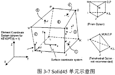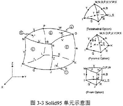 根據(jù)問題的性質(zhì)和模型的復(fù)雜程度,選用Solid95單元(見圖3-3)。該單元是三維的20個(gè)節(jié)點(diǎn)的結(jié)構(gòu)單元,可以在保證計(jì)算精度的前提下允許實(shí)體中不規(guī)則的形狀存在。每個(gè)節(jié)點(diǎn)存在三個(gè)自由度:X、Y和Z方向的移動(dòng),可應(yīng)用于塑性、脆性、大變形和大應(yīng)變等問題。