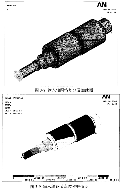 3.3.2.2輸入輸出軸的強(qiáng)度分析 同樣將Pro/ENGINEER中創(chuàng)建的輸入軸和輸出軸模型以IGES格式導(dǎo)入ANSYS中,并作適當(dāng)拓?fù)湫扪a(bǔ),完成預(yù)處理中實(shí)體模型的建立。