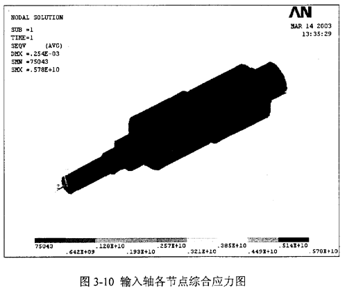 同樣,輸出軸劃分網(wǎng)格并加載后見圖3-11,各節(jié)點(diǎn)位移圖和綜合應(yīng)力圖分別見圖3-12和圖3-13。查詢可知輸出軸了大位移在節(jié)點(diǎn)49處,位移值為0.333mm。平均綜合應(yīng)力為1.5MN/mm2,遠(yuǎn)小于許用應(yīng)力。