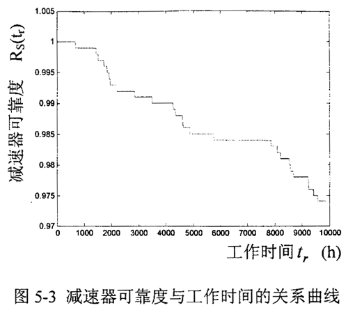 通掃故障樹2000次,產(chǎn)生減速器壽命抽樣值2000個,設(shè)系統(tǒng)最大工作時間Tmax為1000h,考察減速器在工作8760h的可靠度。將Tmax分為1000個區(qū)間,統(tǒng)計減速器壽命抽樣落入各區(qū)間的次數(shù),得到減速器可靠度的仿真值與工作時間的關(guān)系曲線如圖5-3所示。由式(5-13)~(5-20)求得減速器的其他可靠性指標如表5-3和表5-4所示。