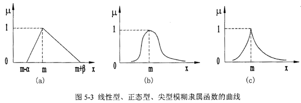 線性型參照函數(shù)在“完全屬于”和“完全不屬于”之間的中介狀態(tài)是線性變化的(見圖5-3a),當x≤m-α和x≥m+β時,μ=0,說明在(m-α, m+β)區(qū)間之外的數(shù)值完全不屬于該模數(shù)數(shù),而其他類型的隸屬函數(shù)曲線兩端延伸到無窮遠(圖5-3b,c),說明整流器個數(shù)軸上的任何數(shù)總在一定程度上隸屬于該模數(shù)數(shù)。在選擇參照函數(shù)時,除非有絕對的擾握認為該事件發(fā)生的概率在某個范圍之間而選擇線性參照函數(shù),否則,以選取正態(tài)型或尖型為好。