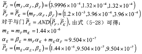 在建立的滾柱活齒減速器故障樹中,用模糊算子AND和OR描述其本事件之間的邏輯關(guān)系。生成真值函數(shù)的模糊形式及采用模糊算子表達的形式見表5-4。根據(jù)模糊數(shù)據(jù)的運算法則式(5-25)、(5-26)和模糊算子AND和OR的計算方法式(5-28)、(5-30)即可確定頂事件發(fā)生的模糊概率。