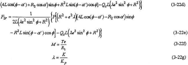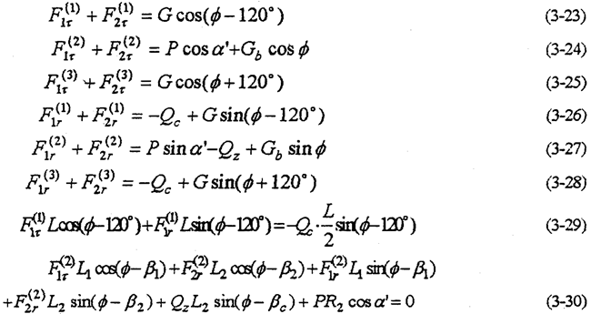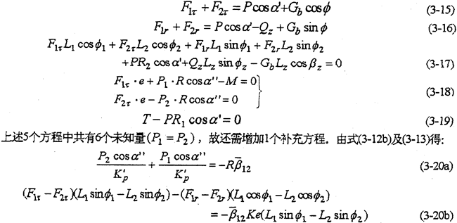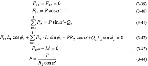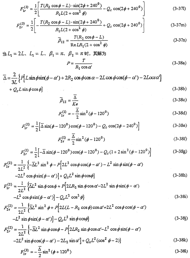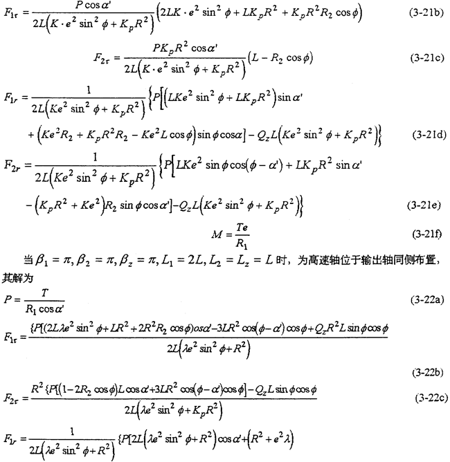 由方程式(3-15)~(3-19)和(3-20)可以完全確定雙軸輸入式的一齒環(huán)內(nèi)齒行星傳動(dòng)機(jī)構(gòu)的動(dòng)力參數(shù)。各動(dòng)力參數(shù)中除嚙合力只與負(fù)載大小有關(guān)外,其余載荷均與傳動(dòng)機(jī)構(gòu)的幾何參數(shù)L1,L2,β1,β2,R1,R2,α′,α″等因素有關(guān)。故可以通過調(diào)整這些參數(shù),以達(dá)到滿足結(jié)構(gòu)、載荷要求。