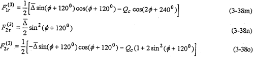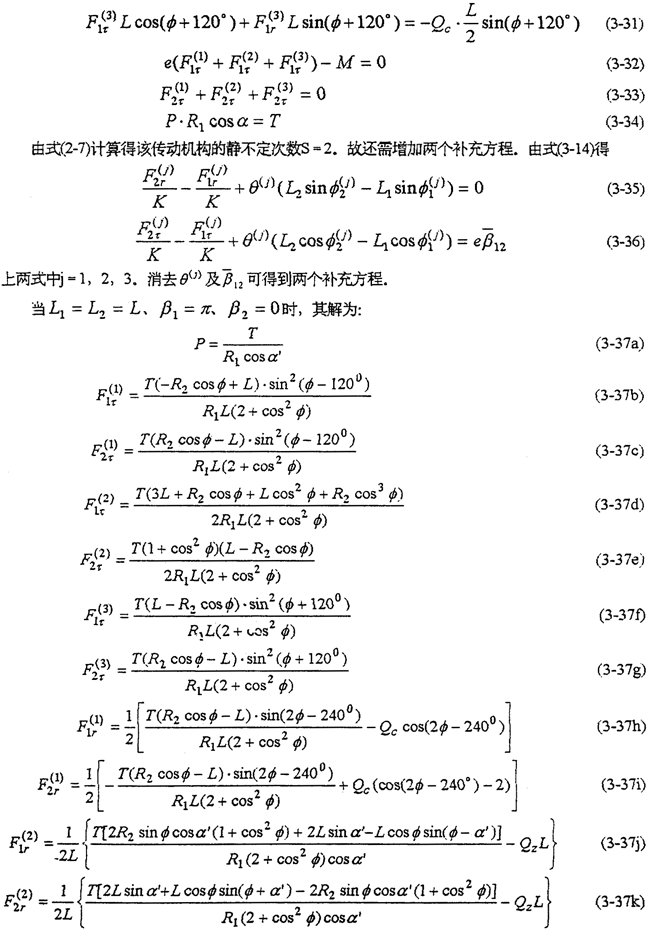 以三相并列雙曲柄機(jī)構(gòu)一齒環(huán)內(nèi)齒行星傳動(dòng)機(jī)構(gòu)為例(見圖1-3圖3-3),帶行星齒板的雙曲柄機(jī)構(gòu)與另外兩套雙曲柄機(jī)構(gòu)相位差互為120°。疫帶行星齒板轉(zhuǎn)動(dòng)的相位角為φ,則另兩相雙曲本機(jī)構(gòu)的相位角為φ-120°及φ+120°由動(dòng)力分析基本方程,取P(1)=P(3)=0,P(j)=P得