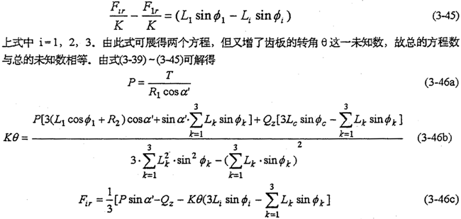 該機(jī)構(gòu)的靜不定次數(shù)S=1,故需增加一個(gè)補(bǔ)充方程,才能完全確定機(jī)構(gòu)的各動(dòng)力參數(shù)。由齒板位移協(xié)調(diào)方程式(3-14)得
