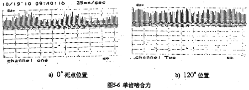 理想情況下,嚙合力的極小值在φ=0°、180°產(chǎn)生,極大值在φ=90°、270°產(chǎn)生,造成位置偏離的影響因素主要有軸承剛度,齒板剛度,嚙合角以及輸入轉(zhuǎn)速、傳動(dòng)比等等。其中軸承剛度的影響極大。在死點(diǎn)的嚙合力也產(chǎn)不并一定為零。哈合力可能為負(fù)值。為負(fù)值時(shí),將阻礙傳動(dòng)的正常轉(zhuǎn)動(dòng),產(chǎn)生內(nèi)齒輪副的干涉現(xiàn)象。并引起減速器沖擊振動(dòng)。因此,按照嚙合力過死點(diǎn)時(shí)為零的假設(shè)分布規(guī)律以及嚙合力為常數(shù)分布規(guī)律的模型分析,所得結(jié)果都是不可靠的。圖5-6是齒板死點(diǎn)位置180°及另一齒板位于超前120°嚙合點(diǎn)的單齒嚙合圖的測(cè)試結(jié)果。圖中每一棒線代表被測(cè)齒受嚙合力作用一次。比較兩圖可知,死點(diǎn)位置嚙合力總體水平低于120°位置時(shí)的嚙合力總體水平,與理論分析計(jì)算的結(jié)果完全吻合。