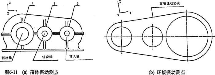 為了將理論分析的結(jié)果與振動測試分析結(jié)果對比印證,將測點選在三個箱體軸承座及齒板支承軸孔的上邊緣,如圖6-11所示。