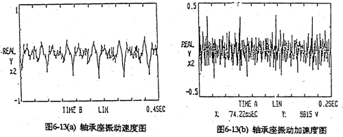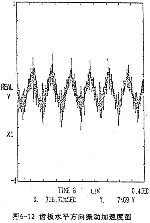 由于機構(gòu)過死點時,因變形要引起死點沖擊,可以通過死點位置及其附近的輪齒(齒板)進行修形,使三相載荷均衡化。圖6-23是將死點位置輪齒修形后,軸承座的振動加速度圖。與圖6-21(a)比較,總體幅值明顯下降。