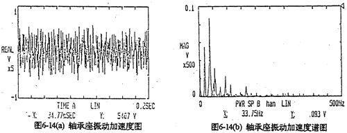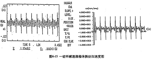由于每片齒板都存在同樣的周期性激勵沖擊函數(shù),相位差120°,迭加后的總效果仍然是轉(zhuǎn)頻周期函數(shù)。因此對箱體軸承座的沖擊也呈周期性。圖6-13是支承軸箱體軸承座的振動速度及加速度的實測時域曲線圖。其曲線圖的變化規(guī)律及幅值與圖6-4完全接近。速度及速度沖擊值為vxmax=15.09mm/s,αmax=24960mm/s2。圖6-14是輸入軸軸承座的實測振動加速度時域曲線及其頻譜分析圖。從加速度譜圖中看出,第一譜峰的頻率值為33.75Hz,恰好是輸入軸轉(zhuǎn)頻的二倍,也是死點沖擊頻率。死點沖擊是一周兩次,其頻率為33.4Hz,這說明理論計算的結(jié)果完全可靠;第二譜峰的頻率值為16.87Hz,與齒板轉(zhuǎn)頻(輸入軸頻率)相近,是齒板的穩(wěn)態(tài)振動頻率;第三譜峰的頻率值為49.55Hz,是三環(huán)減速器的嚙合頻率(50Hz),第四譜峰的頻率值為99.50Hz,是死點的嚙合沖擊頻率。圖6-15是某單齒環(huán)內(nèi)齒行星齒輪減速器的軸承座振動加速度的實測及理論計算曲線圖。從圖可以看出理論和測試的分布規(guī)律極為相似。圖中一個周期有一次較大的加速度沖擊峰,是由于行星齒板過180°死點時產(chǎn)生的嚙合沖擊。