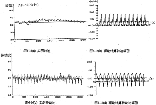 由于機構(gòu)的變形及誤差等原因,將使輸出轉(zhuǎn)速及傳動比動變化,沖擊箱體、產(chǎn)生振動。圖6-16是對SHLEO15型三環(huán)減速器實測及理論計算的轉(zhuǎn)速和傳動比隨時間變化的波動曲線。輸出轉(zhuǎn)速對比為