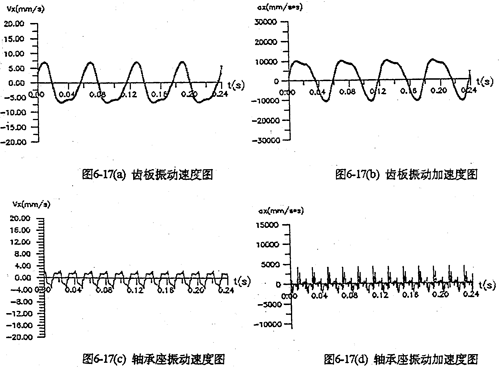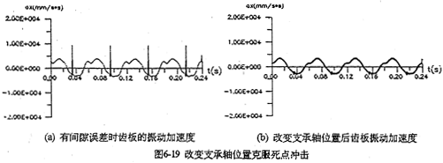 采用雙軸輸人的齒板及箱體軸承座振動速度、加速度如圖6-17所示。從圖看出齒板速度及加速度值明顯變。閱屋S輸人時的0.3倍),而且無沖擊,完全屬于穩(wěn)太振動。箱體的振動速度及加速度幅值只是單軸輸人時的0.2倍。圖6-18a是一軸的偏心套存在0.05度的分度誤差時齒板的加速度曲線圖,圖中明顯出現(xiàn)加速度沖擊棒線。采用雙軸輸入后,死點沖擊被徹底(見圖6-18b) , 變成穩(wěn)態(tài)振動曲線了。因此,為了減小三環(huán)減速器的振動,有必要加大三環(huán)減速器的橫向尺寸,在箱體內(nèi)增加一套雙軸輸入的齒輪功率分流機構(gòu),或者在箱體外另設(shè)計一套功率分流機構(gòu),以解決機構(gòu)過死點的振動問題。