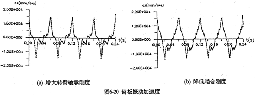 增大行星軸承剛度的目的在于減小雙曲柄機構(gòu)的變形,降低死點沖擊幅值。并且使各相嚙合力均衡化、減小嚙合沖擊。圖6-20是分別將行星軸承剛度增加一個數(shù)量級和內(nèi)齒圈降低一個數(shù)量級時齒板的振動加速度。兩者加速度幅值均降低了1/4倍左右。