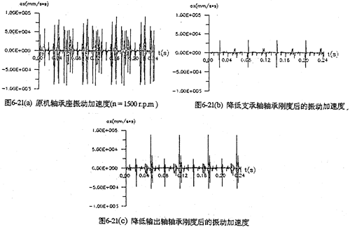 降低箱體軸承剛度是為了吸收內(nèi)部機構(gòu)對箱體的沖擊振動,減小沖擊幅值。圖6-21是轉(zhuǎn)速為1500(rpm)即時分別將支承軸及輸出軸的箱體軸承與軸之間加一3mm的彈性墊圈時,計算出的箱體振動加速度曲線。從圖中看出,減小支承軸箱體軸承剛度比減小輸出軸箱體軸承的效果更明顯。