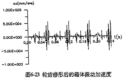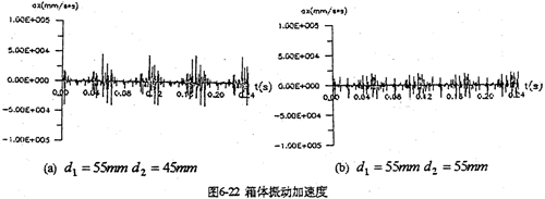 增加高速軸的剛度是降低沖擊載荷的重要途徑。軸的剛度大(值徑大),扭轉(zhuǎn)、彎曲變形小,雙曲柄機構(gòu)變形也就小,這樣既減小了沖擊振動、又增加了軸的強度。圖6-22將高速軸的直徑由原來的45mm加到55mm后的,振動加速度圖。