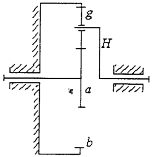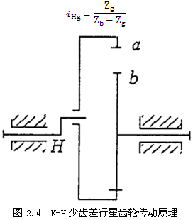 平行軸擺線針輪的基本原理是K-H少齒差行星齒輪傳動(dòng)原理,見(jiàn)圖2.4,它應(yīng)用2.1中結(jié)構(gòu)形式,將平行雙曲柄四桿機(jī)構(gòu)的曲柄,α是連桿內(nèi)齒輪,b是定軸輸出外齒輪。其傳動(dòng)比為: