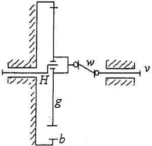 由公式(2-1)可知,在徑向尺寸受到一定的限制時(shí),要獲得較大的傳動(dòng)比,必須減少中心輪Za的齒數(shù)。但Za受到最小根切齒數(shù)的限制,不能太小。因此,為了獨(dú)得較大的傳動(dòng)比,人們把行星輪加大,甚至完全去掉中心輪,于是演變出行星齒輪傳動(dòng)的另一種形式:K-H-V行星齒輪傳動(dòng),其結(jié)構(gòu)圖見(jiàn)2-2所示。它的基本構(gòu)件中心輪b、轉(zhuǎn)臂H和構(gòu)件V,當(dāng)中心輪固定,轉(zhuǎn)臂為主動(dòng),構(gòu)件V從動(dòng)時(shí),傳動(dòng)比為: